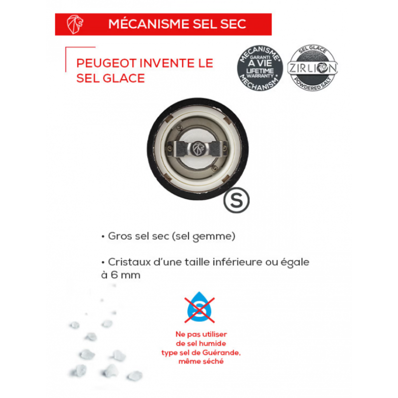 De zoutmolen is uitgerust met het gloednieuwe Zirlion Peugeot-mechanisme: het eerste zirkonia-mechanisme, het meest efficiënte ter wereld. Het robuuste en duurzame Zirlion-mechanisme, met levenslange garantie, zorgt voor een uiterst nauwkeurige maling, van ijskoud zout met uitzonderlijke finesse tot knapperig zout. Het is gemaakt van zirkonium en biedt een uitstekende corrosiebestendigheid, zelfs in ruimtes met een hoge luchtvochtigheid. Het is gemaakt van zirkonia en biedt een uitstekende corrosiebestendigheid, zelfs in ruimtes met een hoge luchtvochtigheid. Bovendien kan het een grote verscheidenheid aan droge zouten malen.