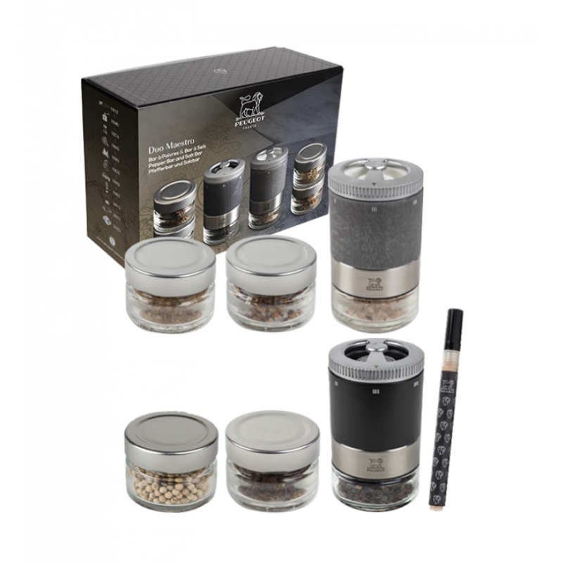 De Peugeot Maestro Kruiden- en Zoutmolenset Duo in Grafiet Hout U’Select 6 Delen daagt je uit met een uniek concept van multi-peper- en multi-zoutmolens met afneembare en verwisselbare glazen reservoirs.