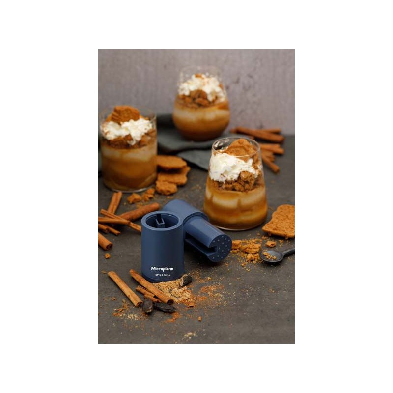 De Mat Denimblauw Microplane Spice Mill nootmuskaat- en specerijenmolen is een praktisch, duurzaam en veelzijdig keukengereedschap om harde specerijen zoals nootmuskaat, kaneel, tonkabonen en nog veel meer fijn te raspen en te bewaren.