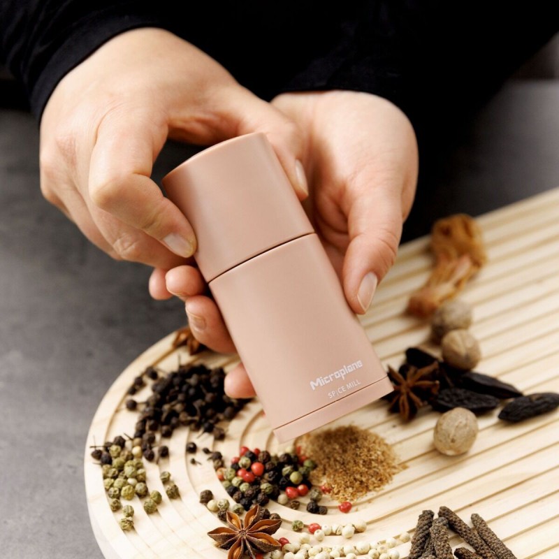De Mat Dusty Rose Microplane Spice Mill nootmuskaat- en specerijenmolen is een praktisch, duurzaam en veelzijdig keukengereedschap om harde specerijen zoals nootmuskaat, kaneel, tonkabonen en nog veel meer fijn te raspen en te bewaren.