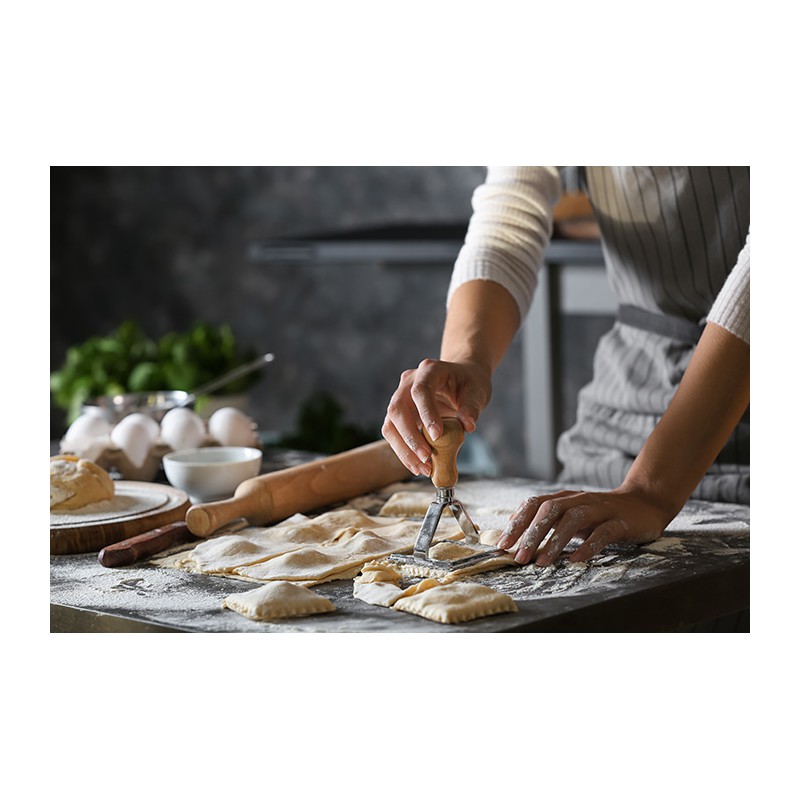 De raviolivorm heeft een afgerond, natuurlijk houten handvat voor een gemakkelijke grip en prettig gebruik, of je nu rechts- of linkshandig bent. De vierkante ravioli-koekjesvorm van 4x4 cm garandeert zuivere en perfecte sneden.