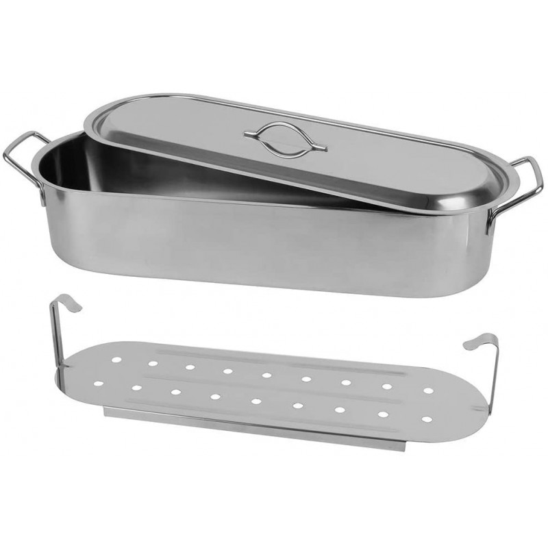De roestvrijstalen Vispocheer & Stoompan met Inzet 60 cm is ideaal voor het koken van hele vis in courtbouillon, in de oven of op het fornuis.