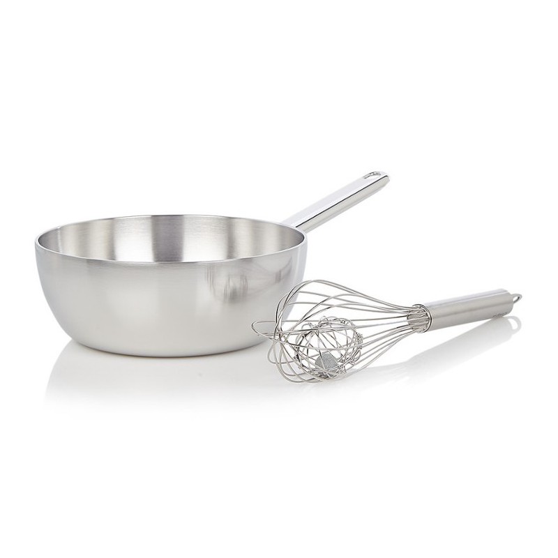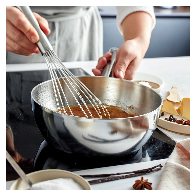 De Demeyere Apollo Conische Sauspan 20 cm + Duo Klopper Gift Set is een 2 liter sauteerpan zonder deksel, vergezeld van een Cuisipro duo klop.