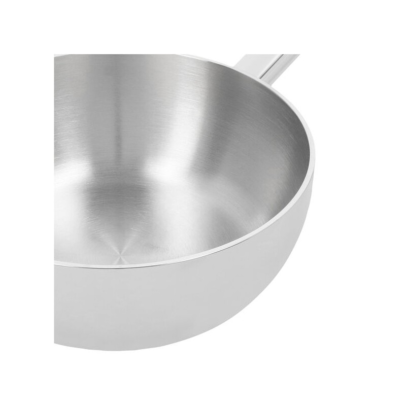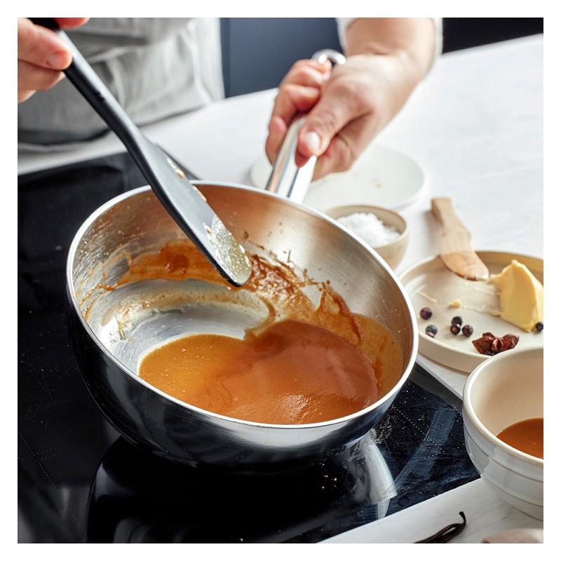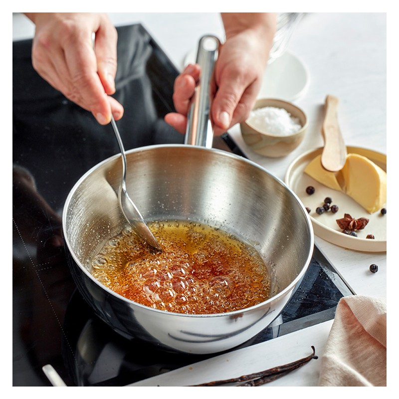 De kegelvormige sauteerpan is ideaal voor het bereiden van delicate sauzen. De gelijkmatige warmteverdeling voorkomt dat de saus gaat stremmen of aankleven en de speciale rondheid aan de binnenkant is perfect om te mengen en op te kloppen. Een heerlijke sabayon of een lekkere chocoladesaus ligt zo binnen ieders handbereik. Het is ook ideaal om kleine groenten voorzichtig te koken.