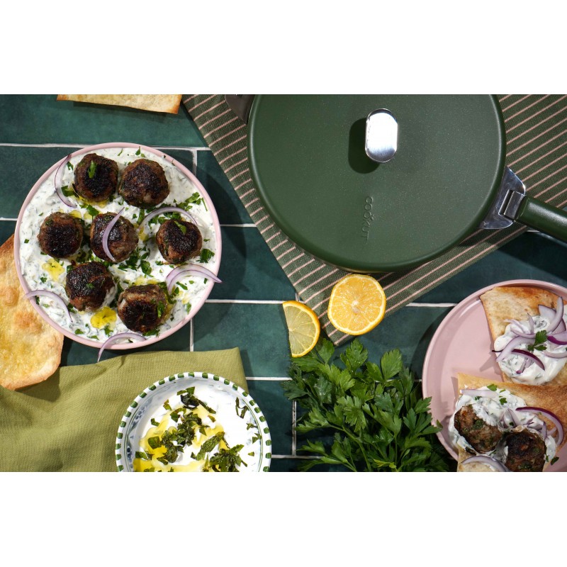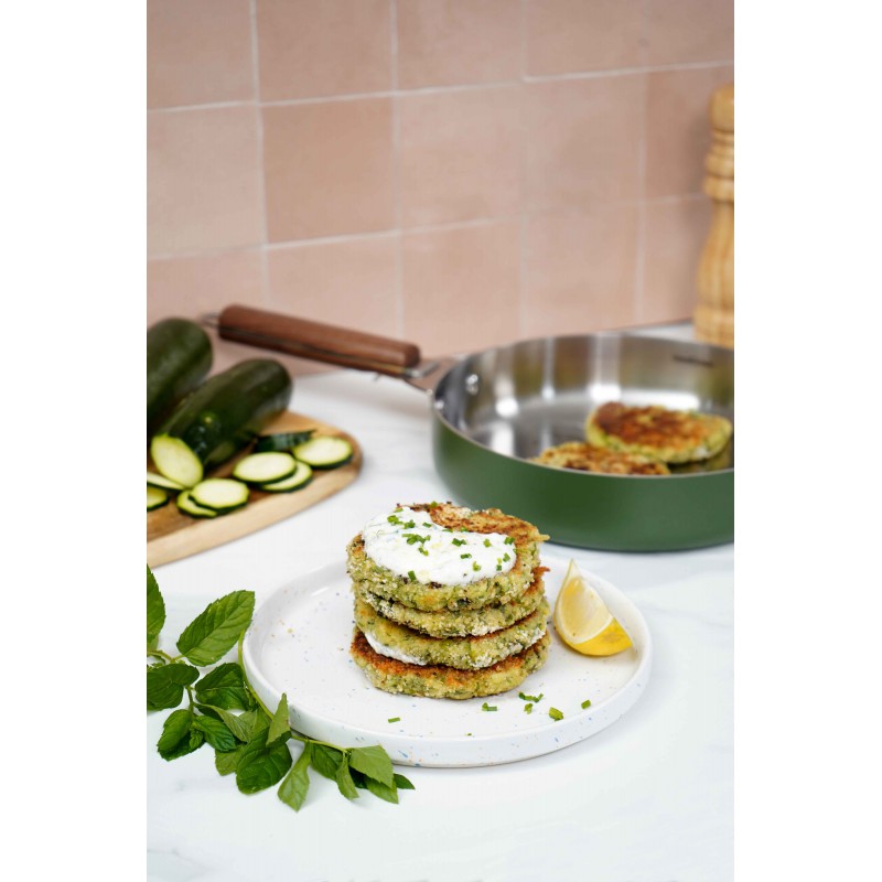 De Merveilleuse Varengroen roestvrijstalen Koekenpan 24 cm 1,8 l met afneembare handgrepen van Cookut is een hoge koekenpan van nikkelvrij, PFAS-vrij en PFOA-vrij roestvrij staal, ideaal voor dagelijks koken voor 2 tot 4 personen. De lichtgewicht en handzame sauteerpan zonder deksel is gemaakt van 3-laags roestvrij staal en is geschikt voor alle warmtebronnen, inclusief inductie, en ovenbestendig tot +220 °C (zonder handgrepen).