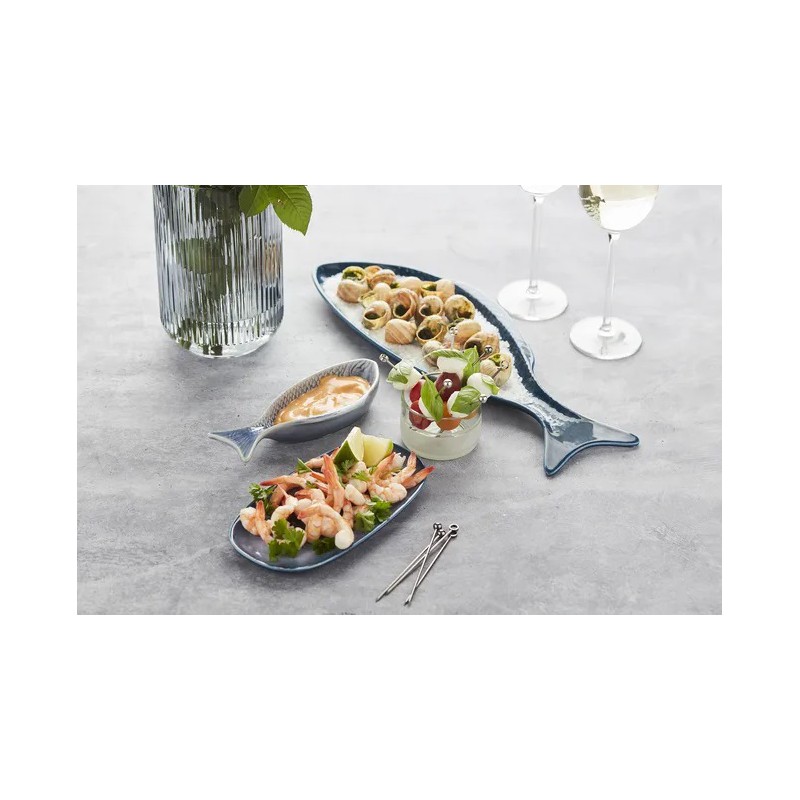 De Vis Serveerschaal Blauw 18x7 cm van Point Virgule is een kleine presentatieschaal in de vorm van een vis die perfect geschikt is voor chips, tapas, dips of tapenades als aperitief, maar ook sauzen, mayonaises en vinaigrettes om uw gerechten te begeleiden tafel.
