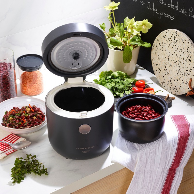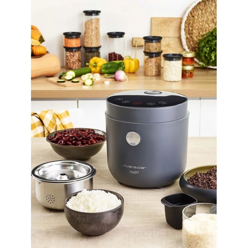De "Low Sugar" QCR370 Rijstkoker van Riviera en Bar is een snelkookpan waarmee je rijst en peulvruchten kookt voor maximaal 10 personen. Het heeft 6 voorgedefinieerde programma's, waaronder het specifieke programma "Low Sugar", waarmee u het koolhydraatgehalte en de calorie-inname van uw rijst kunt verminderen.