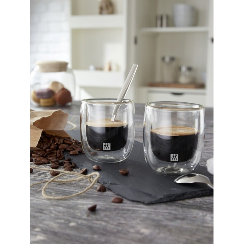 De Set 2 Sorrento Dubbelwandige Koffie Glazen 200 ml van Zwilling een set of elegante koffiekopjes, licht en stevig.