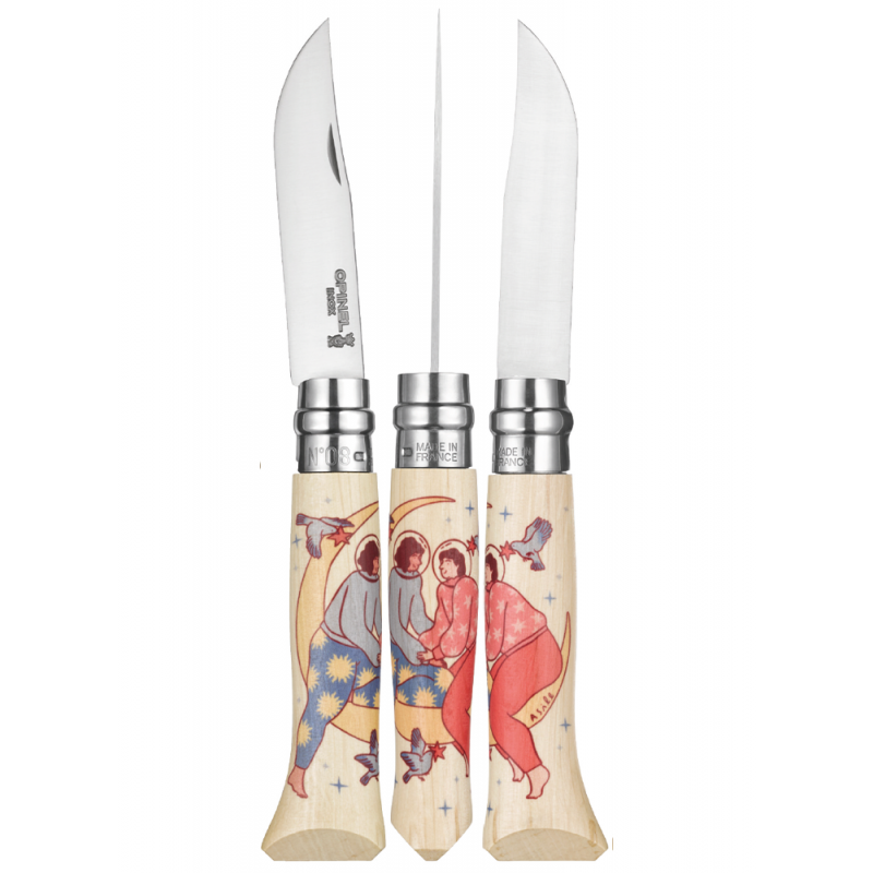 Het Opinel Cosmos No. 08 roestvrijstalen mes met houten handvat, 8,5 cm, Asile Special Edition is een opvouwbaar zakmes, ontworpen in samenwerking met Asile, kunstenaar en illustrator. Het is verkrijgbaar in een gelimiteerde oplage van slechts 8200 stuks en heeft een genummerd lemmet.